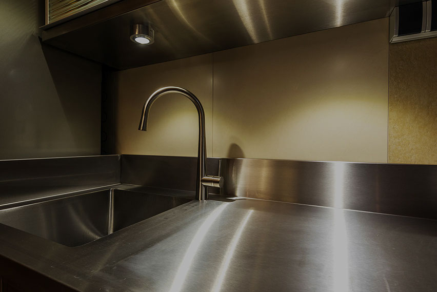Stainless worktops and surfaces.
